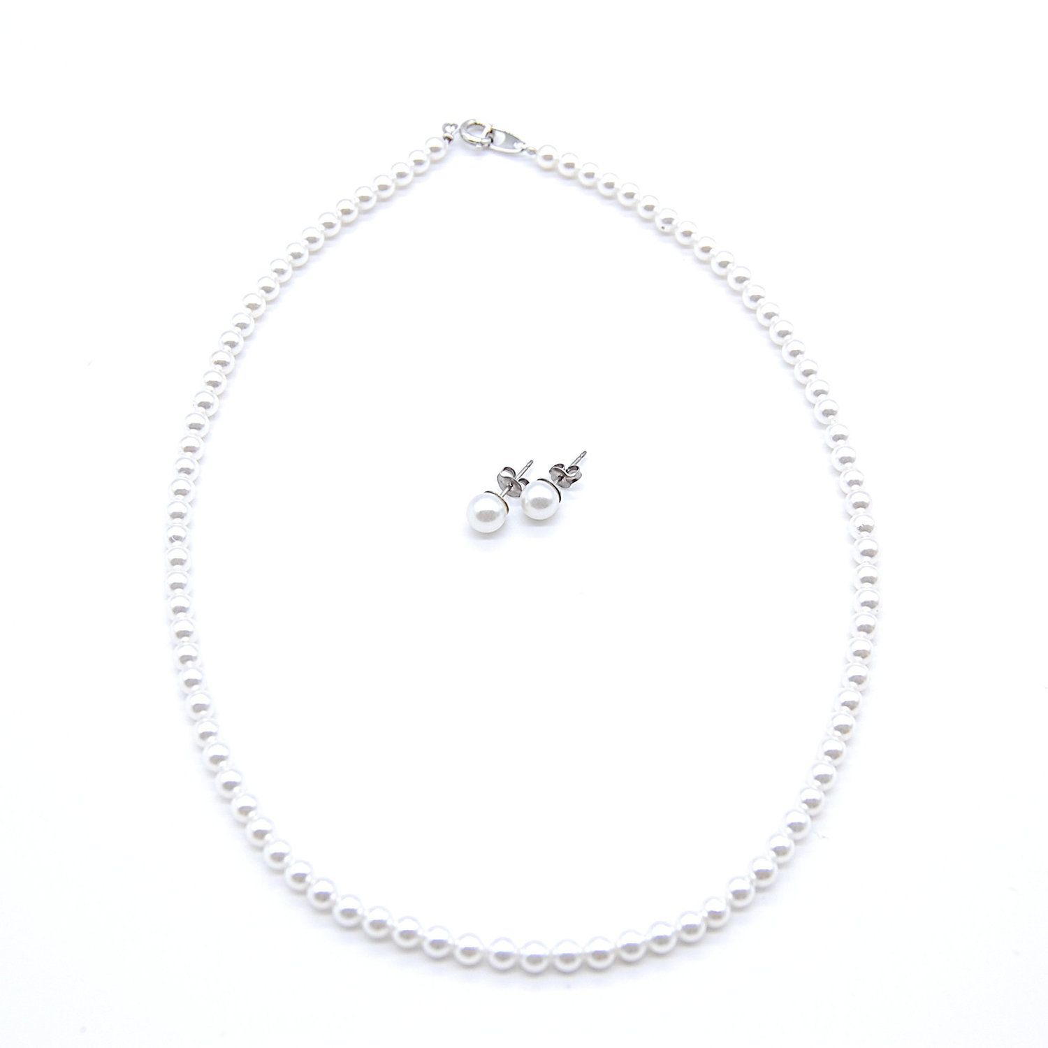 4mm玉の貝パールネックレスは普段のオシャレからフォーマルな場面でもお使いいただけます。少し大き目のピアスと合わせていただき、印象的で上品な装いになります。汗にも強く、お手入れは乾拭きだけで十分です。