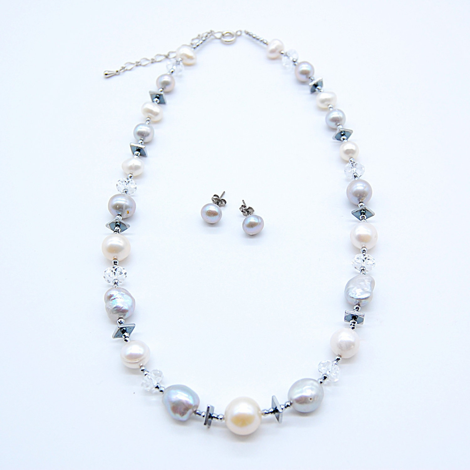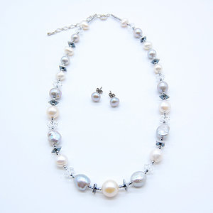 ●素材:[ネックレス]淡水パール・ヘマタイト、水晶、金具:合金、[ピアス]グレー淡水パール、チタン