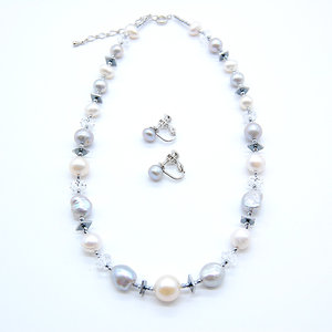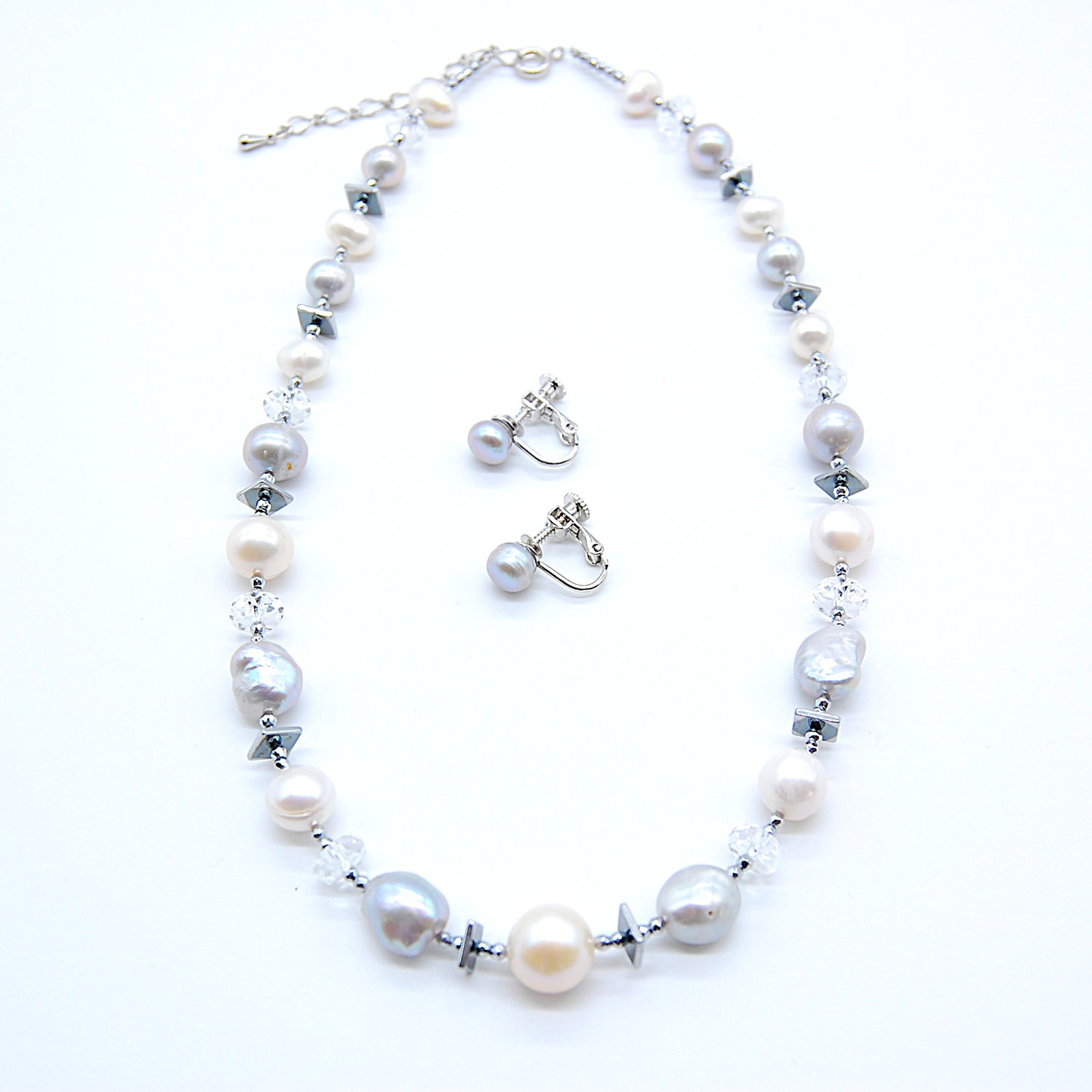 ●素材:[ネックレス]淡水パール、ヘマタイト、水晶、金具:合金、[イヤリング]グレー淡水パール、合金、ネジばね式