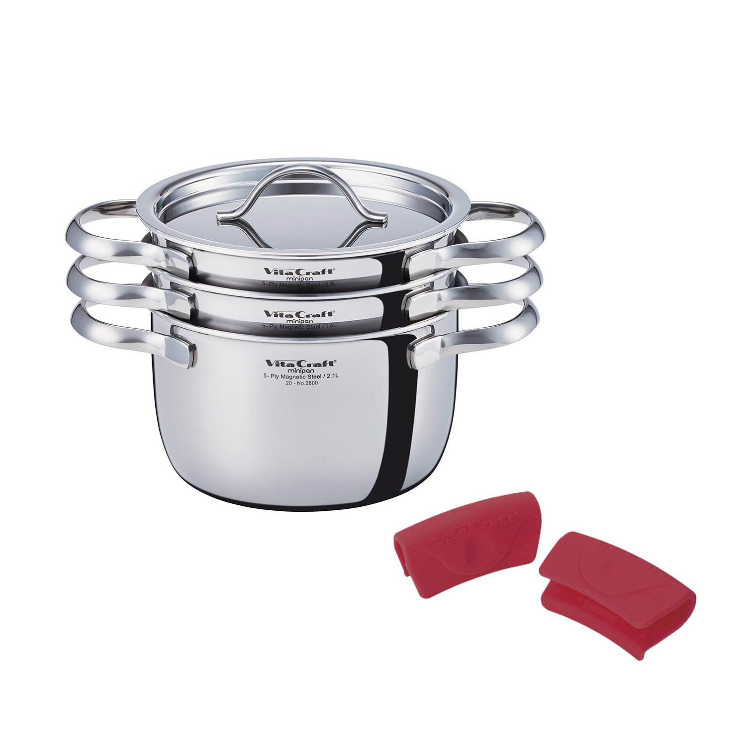 かわいいルックスからは想像もつかない、全面5層構造の高機能。キッチンの小さなスペースでも、3つ重ねてコンパクトに収納できます。※ガス火、IH(電磁調理器)ともにお使いいただけます。