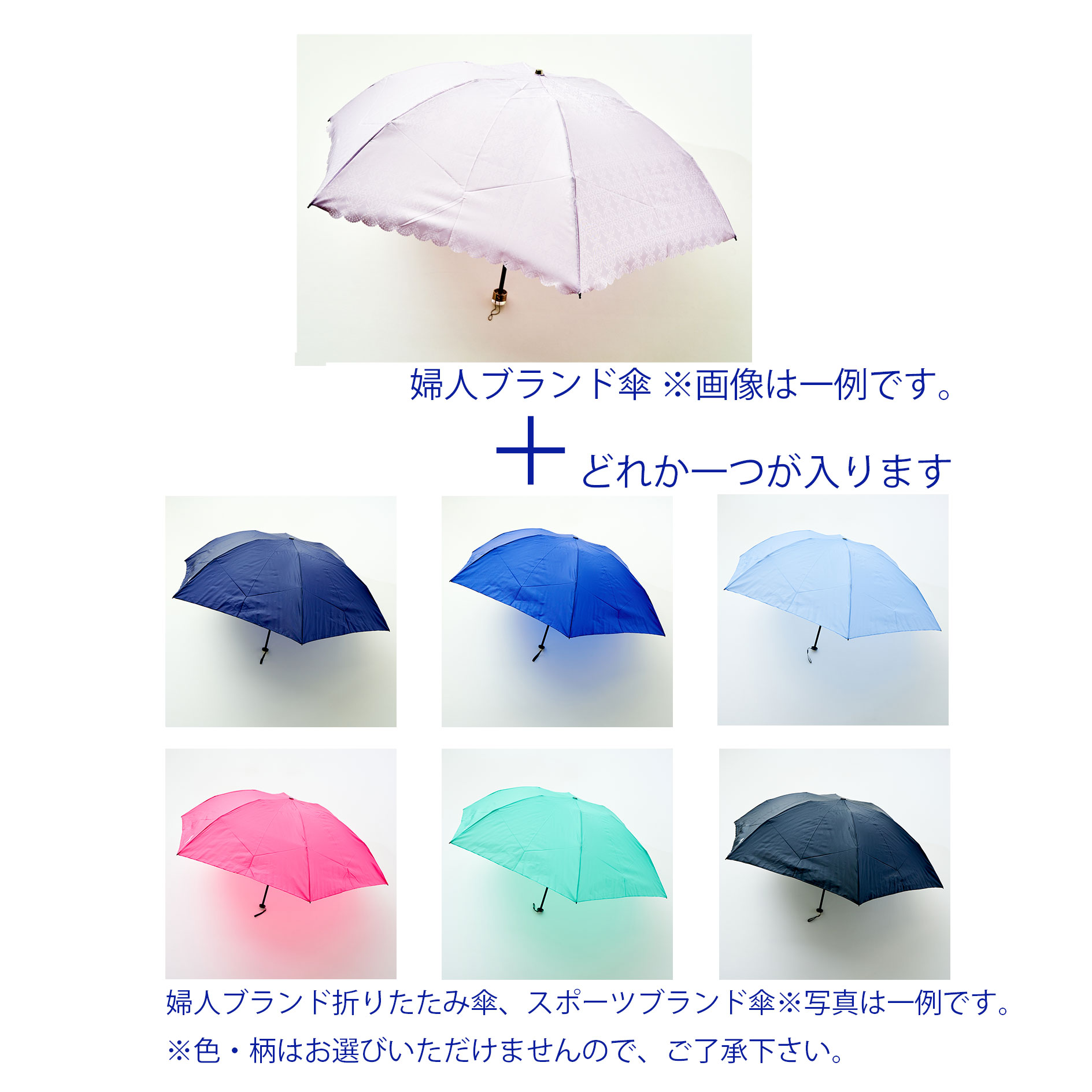 ●内容:婦人ブランド折りたたみ傘、スポーツブランド傘※写真は一例です。※色・柄はお選びいただけませんので、ご了承下さい。※お届けは1月2日(金)以降となります。※お届け日をご指定いただく場合は、ご注文の際に「配送指示事項」欄に1月2日以降の日付をご入力ください。指定日お届けは、2026年1月15日(木)まで承ります。※一部離島などお届けできない地域がございます。※ご用向きのご指定は承れませんのでご了承ください。※ご注文後の変更・キャンセルはご容赦願います。※お客様都合による返品はご容赦願います。※異なる商品を一緒にご注文いただいた場合、商品によりましてはお届けが別々になる場合がございます。※クール配送商品、さっぽろ店からの配送商品は通常配送商品とは別々に送料がかかりますのでご了承ください。※複数回に分けてご注文いただいた場合、商品のお届けは別々になります。まとめてのお届けは承れません。配送料も1回のご注文ごとに頂戴いたします。・「買物かご」に商品を入れた時点では、商品は確保されていません。・ご注文の確定前に品切れとなる場合があります。商品の確保はあくまでご注文の完了時となります。>>2025冬の福袋 レディスファッション雑貨 商品一覧>>2025冬の福袋 レディス 商品一覧>>2026冬の福袋 商品一覧