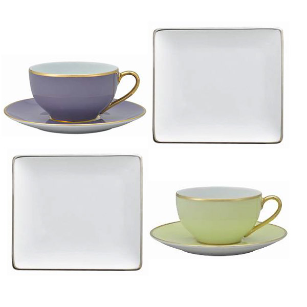 レクタングラープレートGO×2 ティーカップソーサーライラック/アップルグリーン各1のセットです。フランスリモージュのレッグ社の白磁が美しいシリーズです。長角のプレートはデザートやおつまみにも最適です。カップソーサーは外側のパステルカラーがお茶の色をキレイに引き立てます。