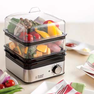 スクエア型フードスチーマーは火を使わず安心の電気蒸し器。ヘルシーな蒸し料理も手軽に出来ます。40分タイマー、空焚き防止機能付き。便利なスチーム皿やレシピブックも付属。