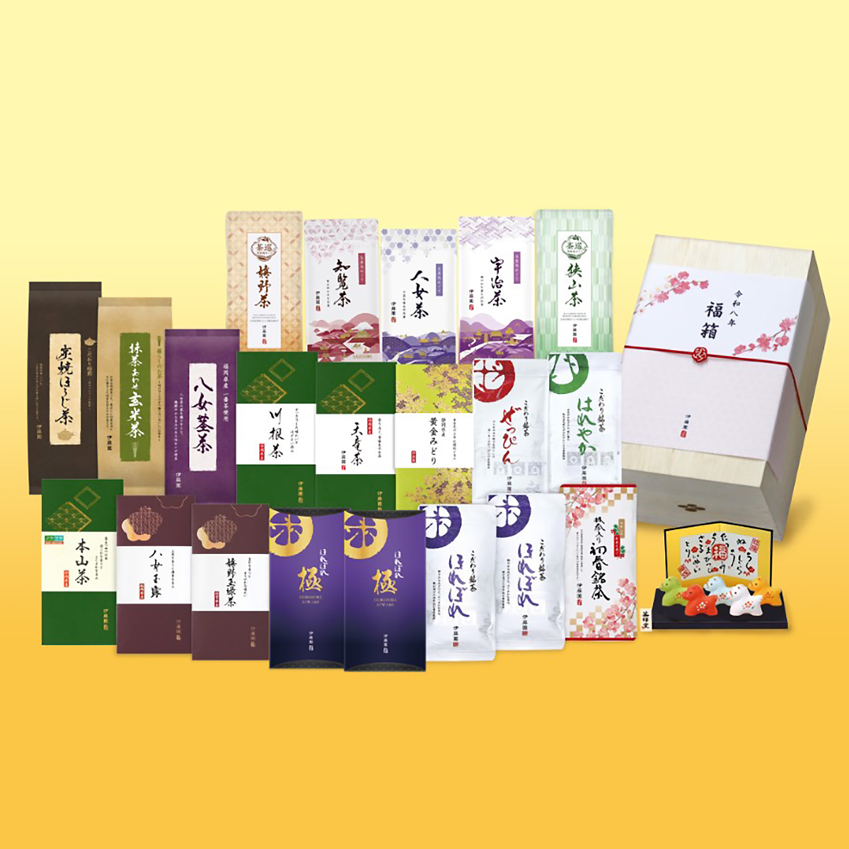 ●内容:ほれぼれ80g×2、はれやか80g、ほれぼれ極50g×2、香りぜっぴん80g、初春銘茶50g、知覧茶80g、八女茶80g、八女玉露80g、八女茎茶100g、嬉野茶50g、天竜茶80g、川根茶80g、狭山茶50g、宇治茶80g、嬉野玉緑茶80g、黄金みどり30g、本山茶80g、炭焼ほうじ茶80g、抹茶あわせ玄米茶160g、干支置物