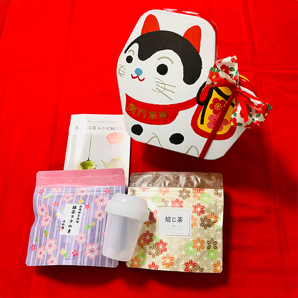 こまいぬの縁起の良いかわいい福箱に、手軽に楽しむことができるお茶を詰め合わせ致しました。茶以外にも、抹茶シェイカー・レシピブックなど抹茶を楽しむセットとなっており、ギフトに、ご自宅用にと賑やかで縁起の良い一品です。