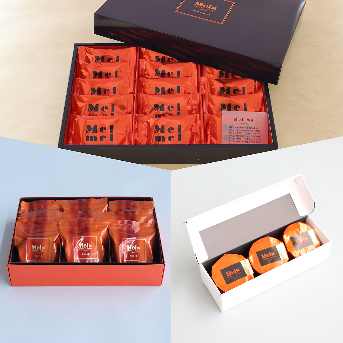 人気NO.1のメルメルを含む、メルズの焼き菓子3種をお楽しみいただけます。北海道美瑛産の小麦粉を使ったサクサクのクッキーで、なめらかなキャラメルソースを包み込んだショコラをサンドし、シンプルながらも味わい深い焼き菓子に仕上げたメルメル。味わいや食感の異なる3種類の焼き菓子がひとつになったトロワ。デザート感覚でもお楽しみいただけるようなリッチな味わいのキャラメルガトーサンドは、キャラメルとショコラを合せた濃厚な味わいの自家製のクリームを、サクッ、ホロッとした食感のガトーブルトンでサンドした3層仕立てです。