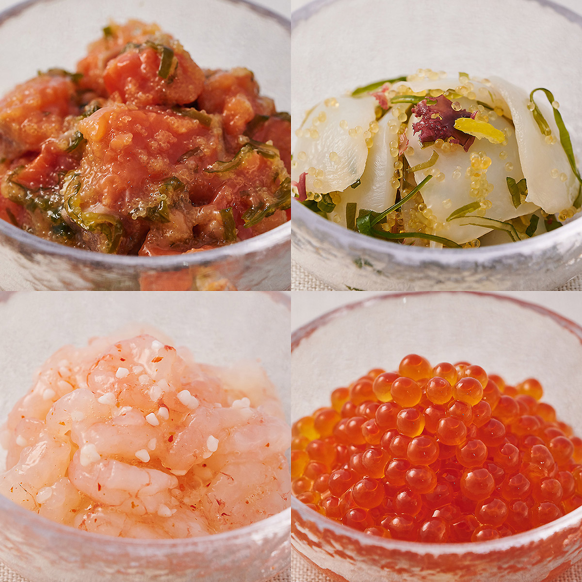 ●内容:王様のサーモン、磯紋甲、甘エビ、北海道産いくら 各100g<
