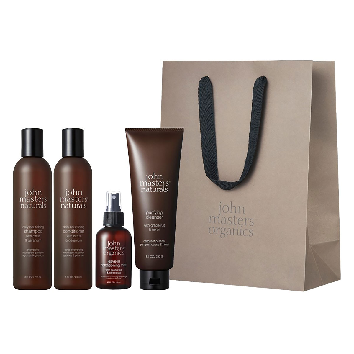 豊かなクッション泡で髪と頭皮を包み込んで洗い、エアリーな髪へと仕上げてくれるC&G(シトラス&ゼラニウム)シャンプーとなじみのよいヤシ油やホホバ種子油などの保湿オイルを豊富に配合したベーシックコンディショナー。「落とす」と「満たす」を叶えるクレンジングジェルとシュッと吹きかけてブラシでとかすだけで瞬時に素直な髪へ導く、洗い流さないトリートメントミストをセットに。全て現品が詰まったお得なバッグです。