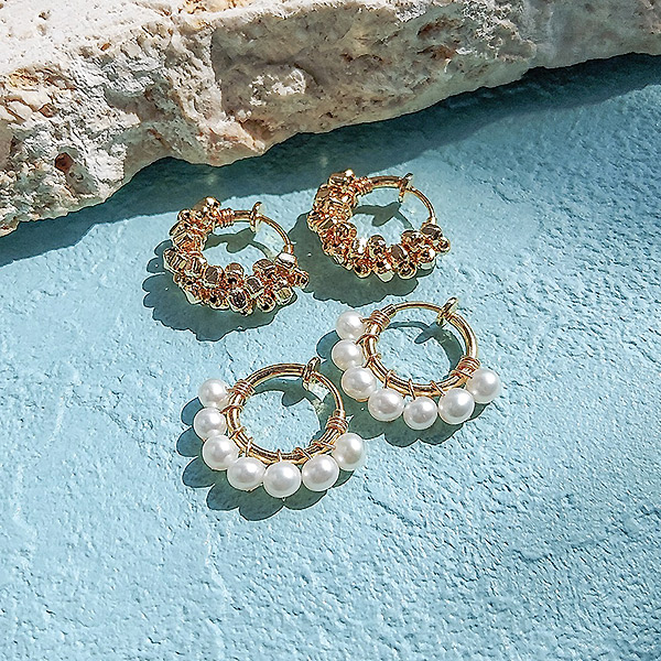 ●素材:[金色] 真鍮(金メッキ)ビーズ/フープ・K14ゴールドフィルドワイヤー、[ホワイト]淡水真珠・真鍮(金メッキ)フープ・K14ゴールドフィルドワイヤー