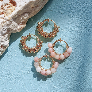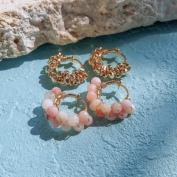 ●素材:[金色] 真鍮(金メッキ)ビーズ/フープ・K14ゴールドフィルドワイヤー、[ピンク]ピンクオパール・真鍮(金メッキ)フープ・K14ゴールドフィルドワイヤー