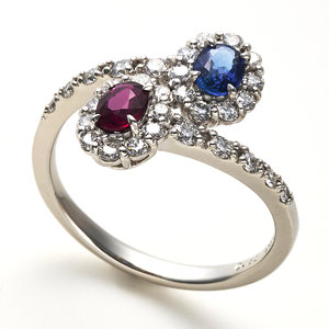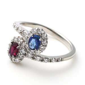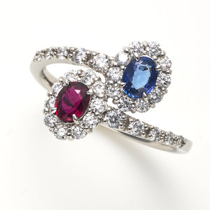 ウェーブラインを描くアーム部に配されたダイヤモンドが、ルビーとサファイアの色彩豊かな輝きを一層引き立てます。人生の節目を彩るお守りジュエリーとして永くご愛用いただける逸品です。