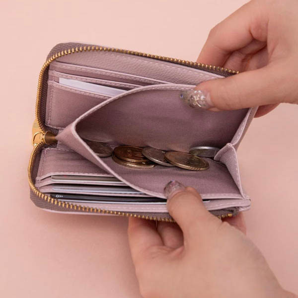 通常の2つ折り財布よりもスリムで、女性の手にもなじむサイズ感。革の味を楽しんでいただけるよう、デザインはシンプルに仕上げました。豊富なカラーバリエーションが嬉しいポイント。小銭入れは取り出しやすいマチ付き。お札は二つ折りで収納可能。