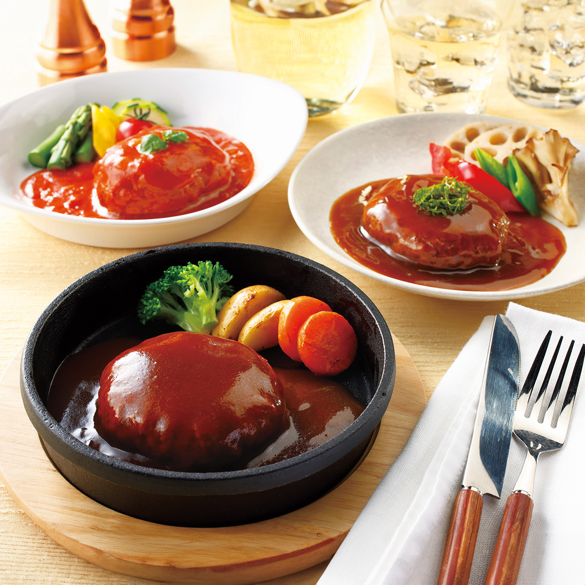 ●内容:煮込みハンバーグ デミグラスソース190g×4、煮込みハンバーグ トマトソース・煮込みハンバーグ テリヤキソース 各190g×3