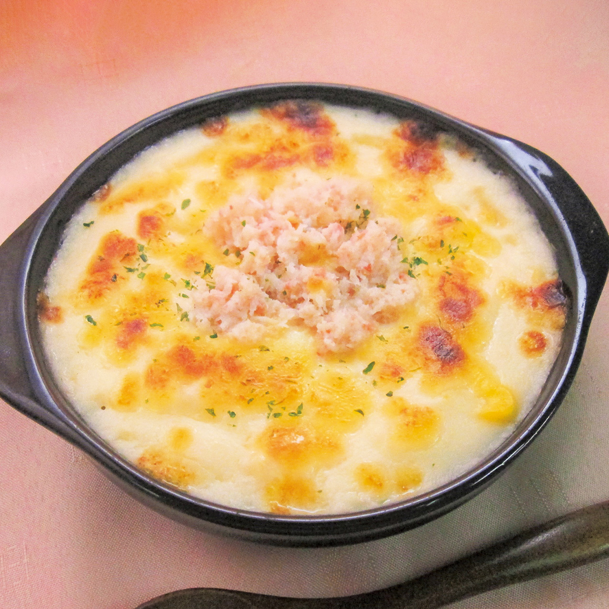 国産の紅ずわい蟹剥き身と3種類のチーズをトッピングした化学調味料不使用のマカロニグラタンです。ソースには鳥取県の大山乳業で作られた白バラ牛乳を使用し滑らかな口溶けに仕上げました。