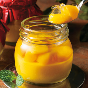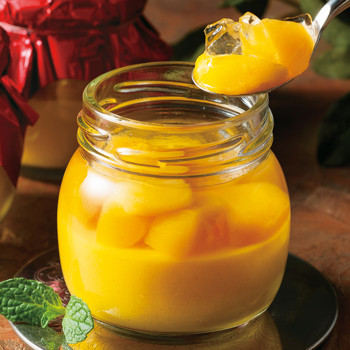 マンゴー果肉が贅沢に入ったスイーツ。あとくちの良い果肉入りのゼリーと、濃厚なマンゴープリンの二層仕立て。フランス国家最優秀職人章「M.O.F」受章の女性天才シェフ、アンドレ・ロジェのこだわりの一品です。