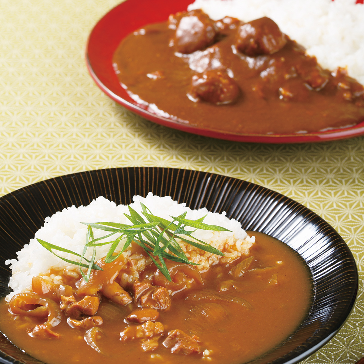 京都の鳥料理専門店≪八起庵≫。やわらかなだしの風味を利かせて作り上げた「京風鶏カレー」と国産鶏つくねがごろっと入った「鶏つくねカレー」のセット。ごはんはもちろん、うどんやそばでも美味です。