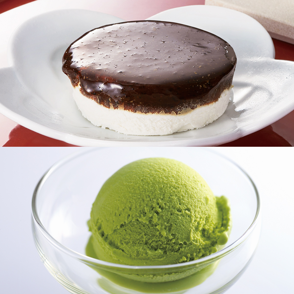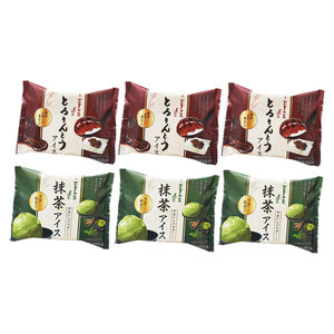 山芋入りで滑らか食感のさっぱりとしたミルクアイスに濃厚な甘味の黒蜜ソースをかけた「とろりんとうアイス」と、宇治抹茶の香り豊かな「抹茶アイス」の詰合せです。