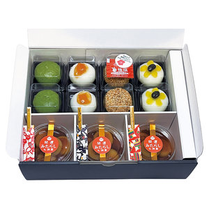 岐阜県海津市にある『千代保稲荷神社』の参道に70余年にわたり名物草もちを製造販売している九洲屋が、縁起がいい食材を使用した開運和菓子のセットを作りました。作り立てを急速冷凍してお届けします。