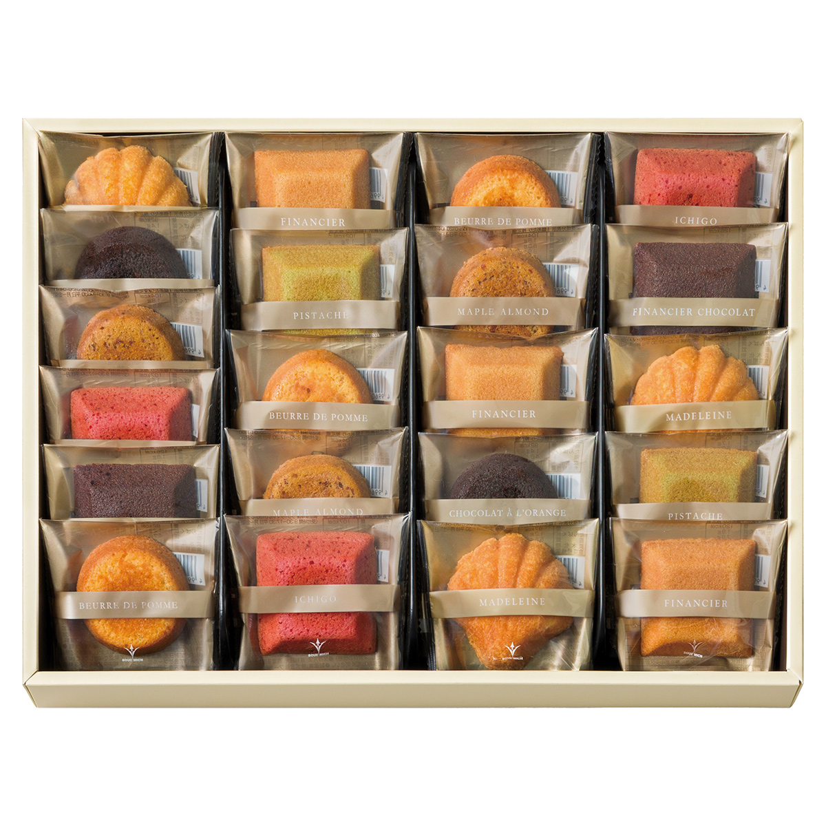 ●内容:マドレーヌ・メープルアーモンドケーキ・いちごバターケーキ・フィナンシェ・りんごバターケーキ 各3、チョコオレンジケーキ・フィナンシェ ショコラ・フィナンシェ ピスタチオ 各2