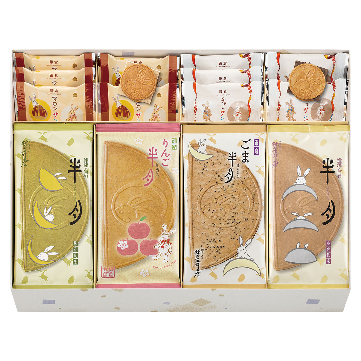 ●内容:鎌倉半月(抹茶風味・小倉風味・ごま半月・りんご半月 各6)、鎌倉チョコサンドだょ・鎌倉マロンサンドだょ 各6