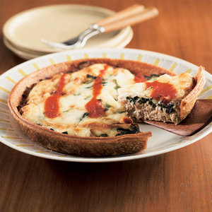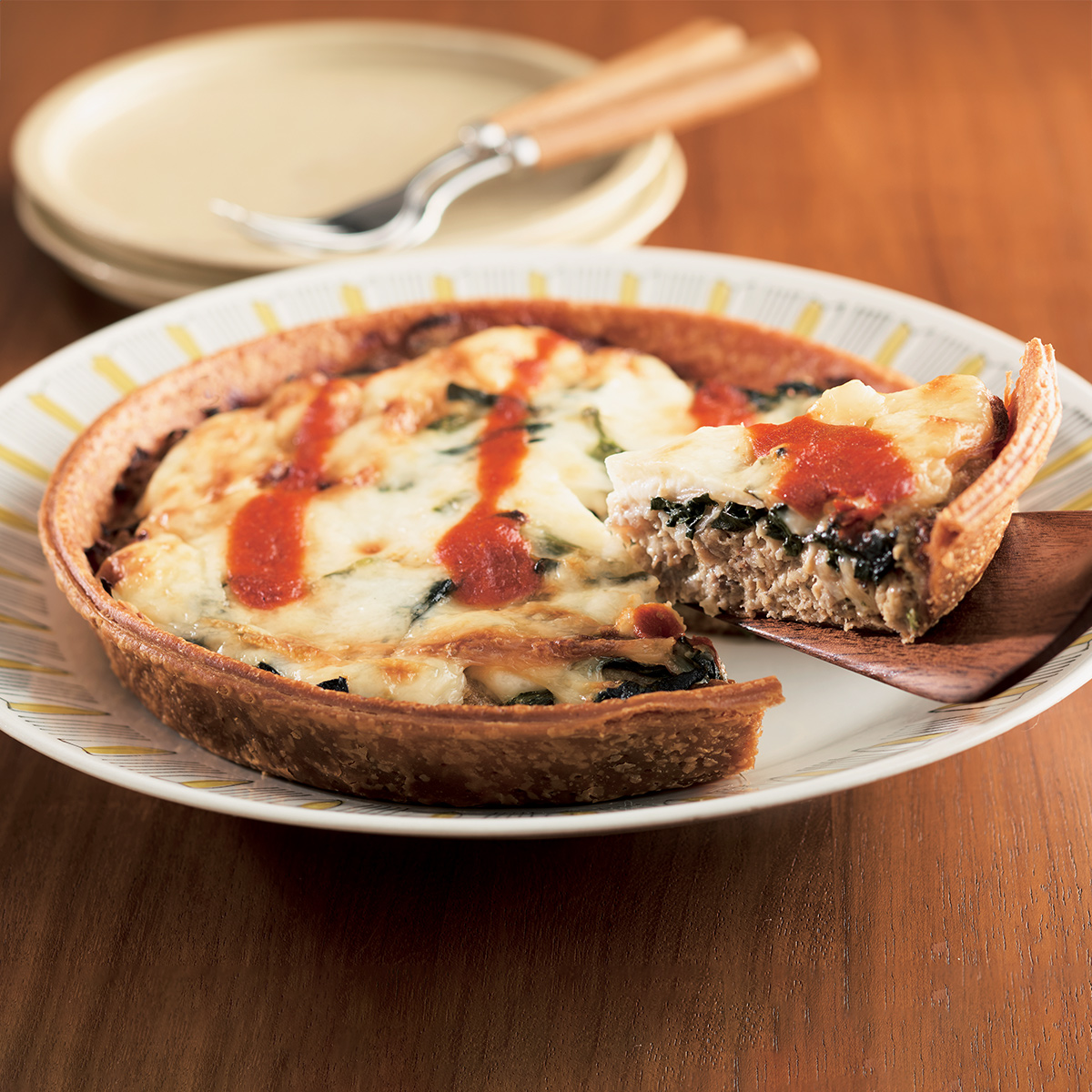 タルトと思ったらお肉みっしりハンバーグ!肉の旨味に玉ねぎの甘みと香ばしさが重なって、ほうれん草が彩りと風味のアクセントに。濃厚な生クリームにトマトソースを加えて味わい深く仕上げました。