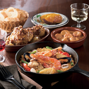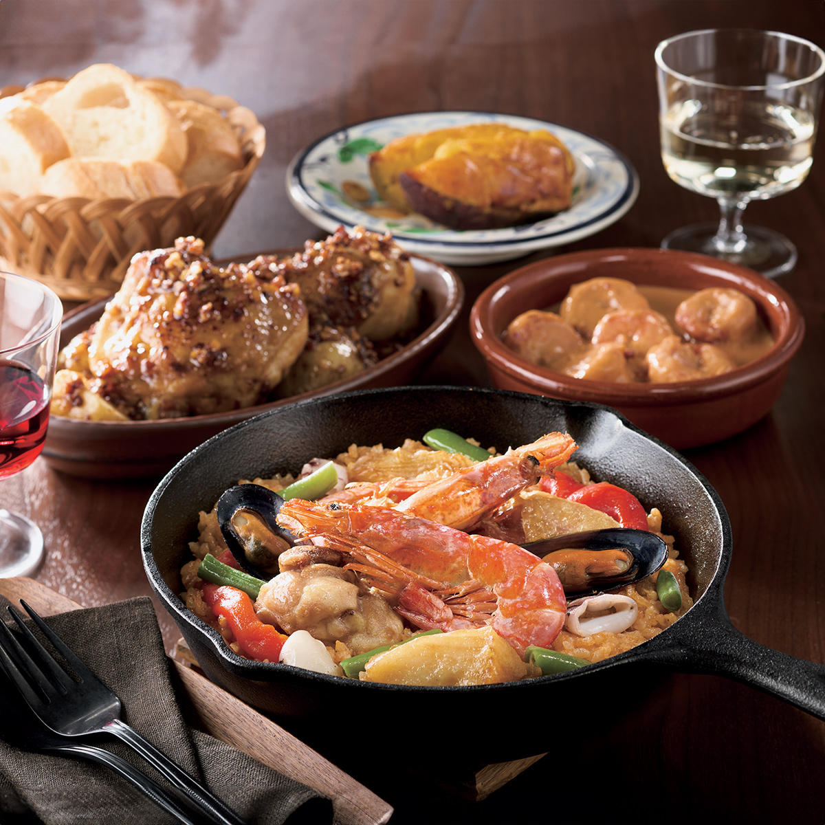 実力派シェフのセットでディナーを小粋に。「国際パエリアコンクール」で優勝したシェフが手掛ける、魚貝の旨みたっぷりのミックスパエリア。タパス(一品料理)やデザートもセットでディナーの準備は万端。