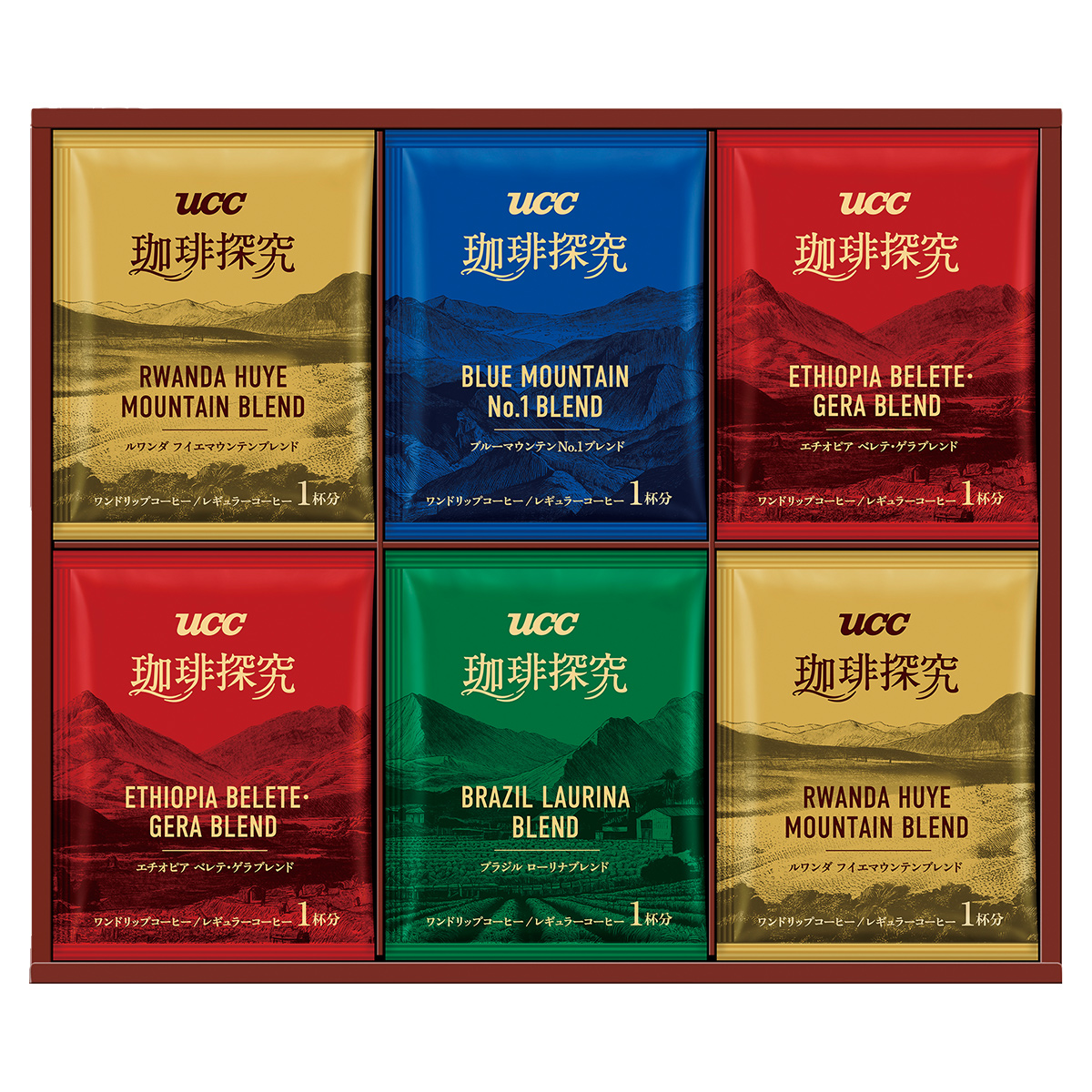 ●内容:ジャマイカブルーマウンテンNo.1ブレンド10g×3、ブラジルローリナブレンド10g×3、エチオピアベレテ・ゲラブレンド10g×6、ルワンダフイエマウンテンブレンド10g×6