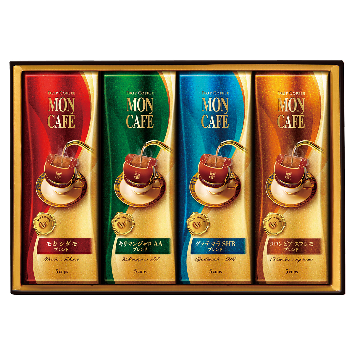 味わいを極めたモンカフェの、多彩なブレンドがお楽しみいただけるギフト。個性豊かなオリジナル ブレンドを豊富にライン アップし、あらゆるシーンに挽きたての美味しさをお届けします。挽きたてのコーヒー豆とフィルターをひとつにして、香りを逃さず一杯分ずつ丁寧にパック。カップにのせて、お湯を注ぐだけで、ドリップ コーヒーならではの芳ばしく、豊かな香りが立ちのぼります。大切なあの方に、優雅なひとときをもたらす贈りものです。