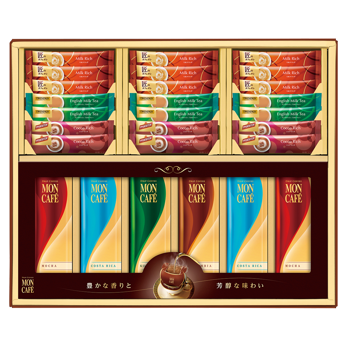 ●内容:匠のカフェオレ(ミルクリッチ×9)、トワイニング(イングリッシュ ミルクティー×6)、バンホーテン(ココアリッチ×6)、モンカフェ(モカブレンド・コスタリカブレンド各6、キリマンジャロブレンド・コロンビアブレンド各3)●商品に含まれるアレルギー特定原材料8品目:乳成分>>東急百貨店のお歳暮・ウィンターギフト コーヒー・紅茶 商品一覧>>東急百貨店のお歳暮・ウィンターギフト モンカフェ・トワイニング 商品一覧>>東急百貨店のお歳暮・ウィンターギフト2025ページ◎こちらの商品はクリスマス包装が可能です。クリスマス包装をご希望の場合は、ご注文の際にご用向き一覧から「クリスマス包装(12/22お届け)」「クリスマス包装(12/23お届け)」「クリスマス包装(12/24お届け)」のいずれかをお選びください。(クリスマス包装の承りは12月12日(金)12時までとさせていただきます。)※画像はイメージです。