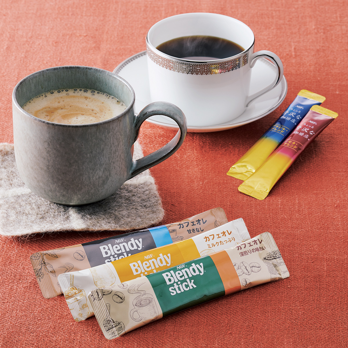 しっかりとコーヒーの風味が感じられるカフェオレと、スティックブラックのアソート。
