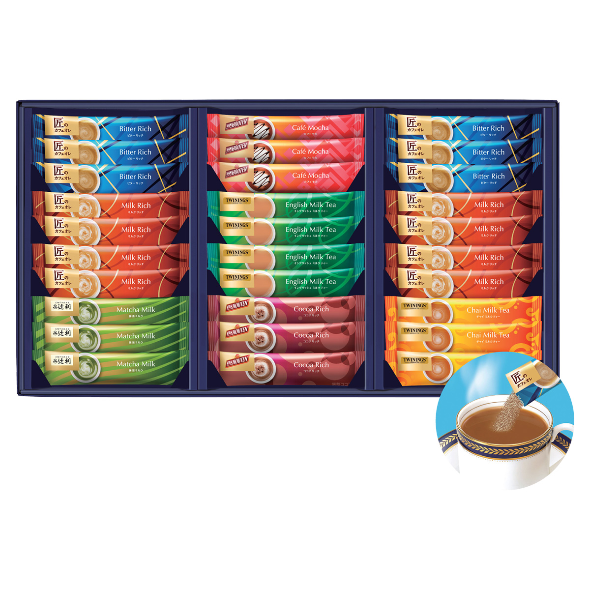 ●内容:匠のカフェオレ(ミルクリッチ×8、ビターリッチ×6)、バンホーテン(ココアリッチ×3、カフェモカ×3)、トワイニング(イングリッシュミルクティー×4、チャイミルクティー×3)、辻利(抹茶ミルク×3)●商品に含まれるアレルギー特定原材料8品目:乳成分>>東急百貨店のお歳暮・ウィンターギフト コーヒー・紅茶 商品一覧>>東急百貨店のお歳暮・ウィンターギフト モンカフェ・トワイニング 商品一覧>>東急百貨店のお歳暮・ウィンターギフト2025ページ◎こちらの商品はクリスマス包装が可能です。クリスマス包装をご希望の場合は、ご注文の際にご用向き一覧から「クリスマス包装(12/22お届け)」「クリスマス包装(12/23お届け)」「クリスマス包装(12/24お届け)」のいずれかをお選びください。(クリスマス包装の承りは12月12日(金)12時までとさせていただきます。)※画像はイメージです。