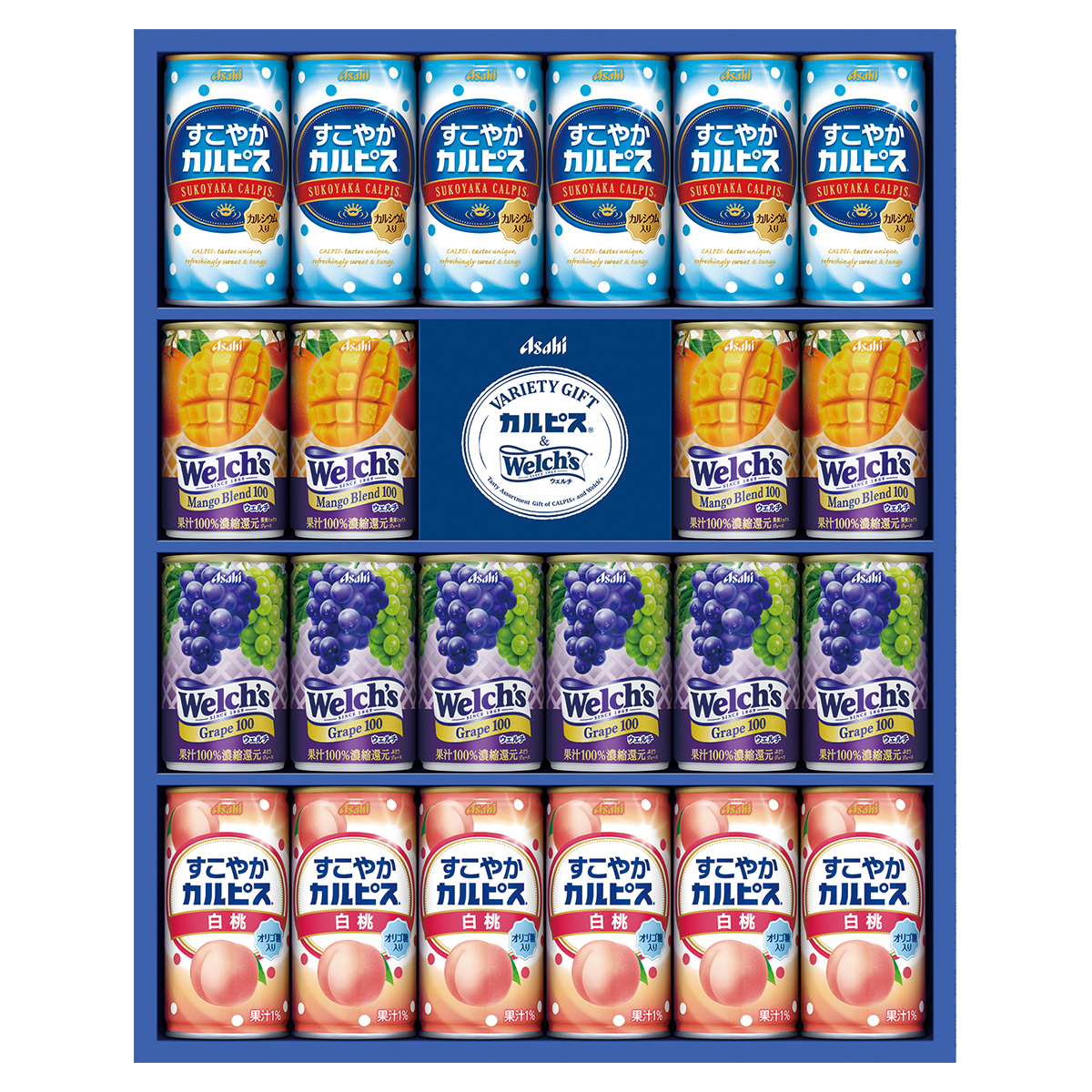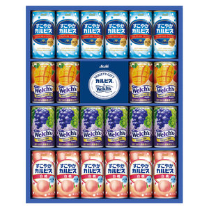 ●内容:すこやかカルピス・すこやかカルピス白桃 各190g×6、ウェルチ グレープ100 160g×6、ウェルチマンゴーブレンド100 160g×4