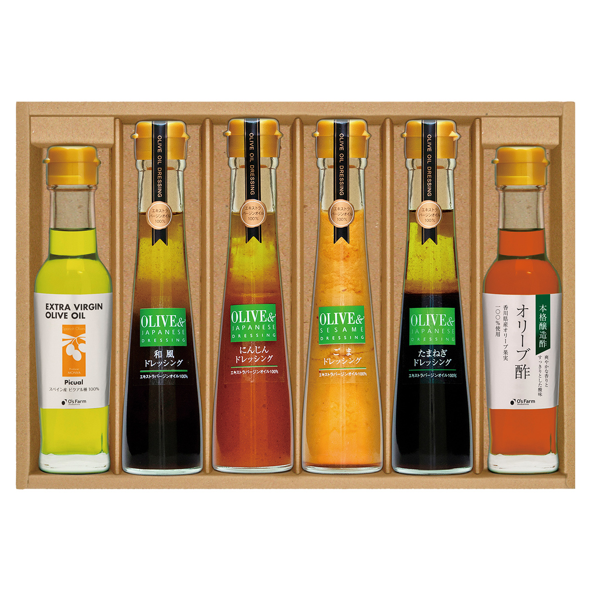 ●内容:ドレッシング(ごま・和風・にんじん・たまねぎ 各120ml)、スペイン産EXVオリーブオイル(ピクアル種100%)100g、オリーブ酢110ml