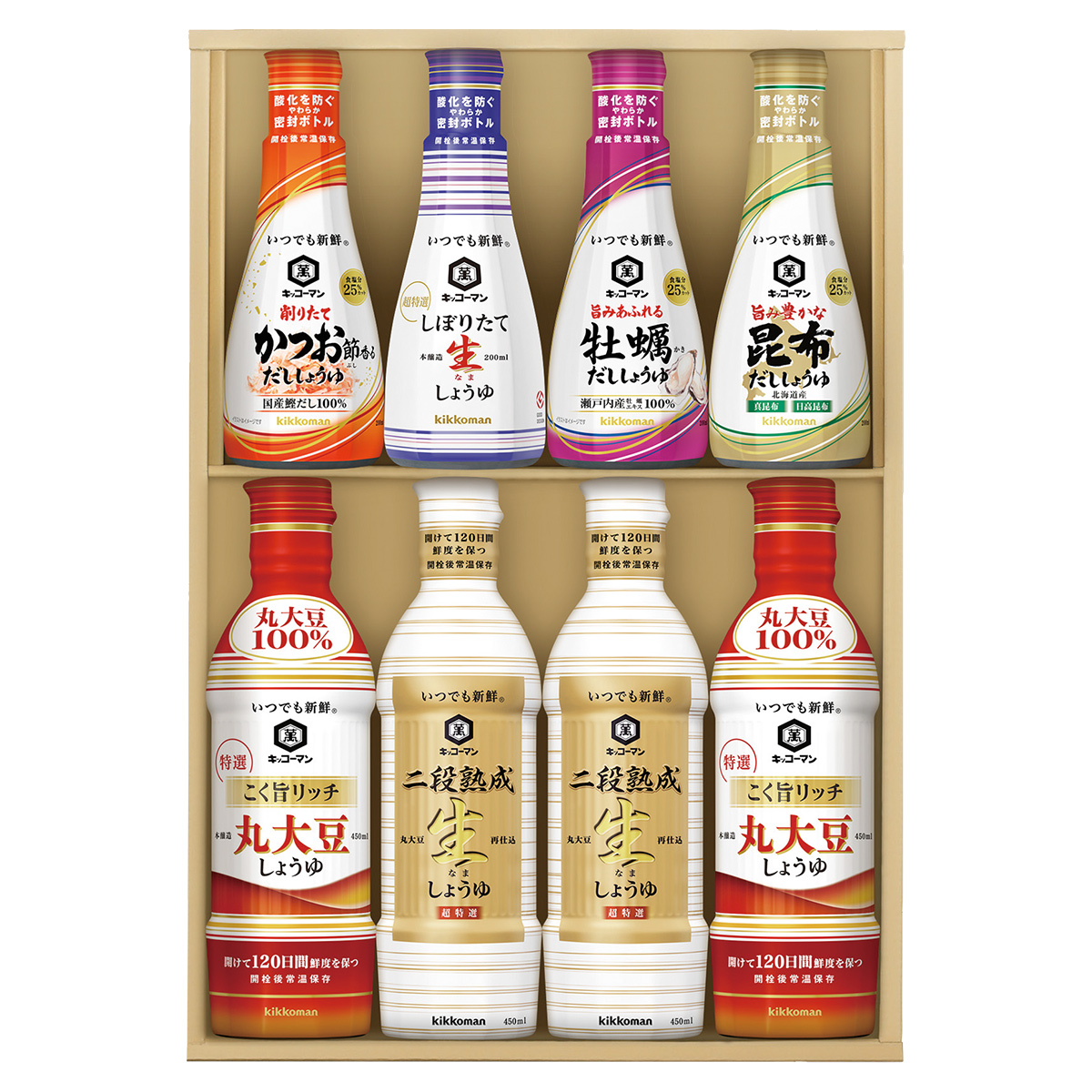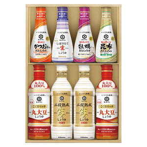 ●内容:いつでも新鮮シリーズ(こく旨リッチ 特選 丸大豆しょうゆ・超特選二段熟成生しょうゆ 各450ml×2、しぼりたて生しょうゆ・削りたてかつお節香るだししょうゆ・旨み豊かな昆布だししょうゆ・旨みあふれる牡蠣だししょうゆ 各200ml)