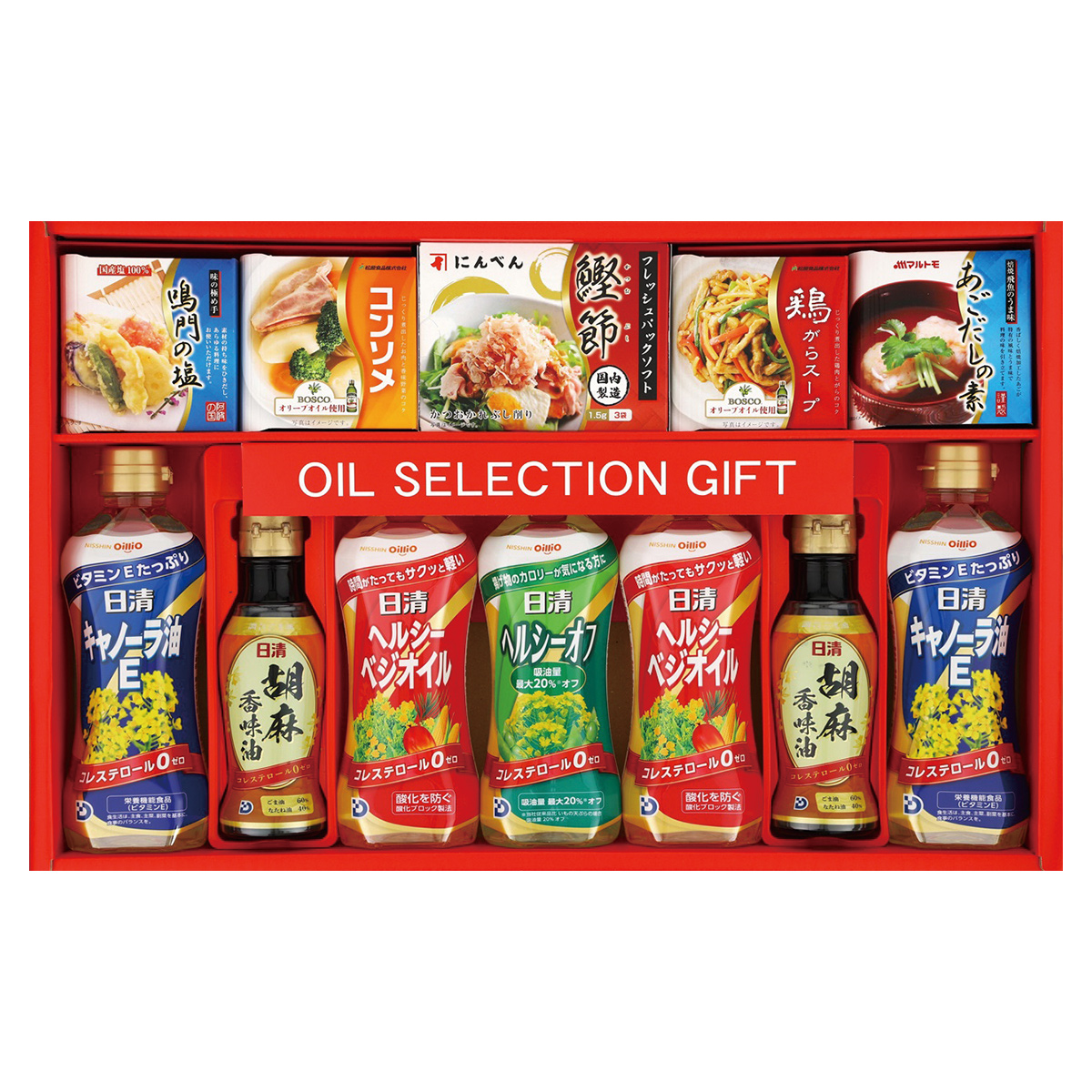 ●内容:日清(ヘルシーオフ350g・ヘルシーべジオイル350g×2・キャノーラ油E350g×2・胡麻香味油145g×2)、鳴門の塩80g、マルトモあごだしの素4g×6、鶏がらスープ20g×2、コンソメ20g×2、にんべん鰹節1.5g×3