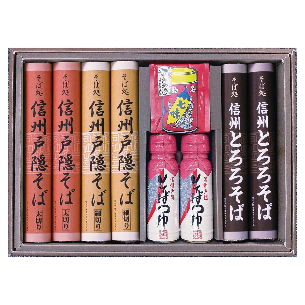 ●内容:信州戸隠そば(太切り・細切り・とろろそば 各150g×2)、信州戸隠そばつゆ100ml×2、八幡屋礒五郎七味唐辛子8g