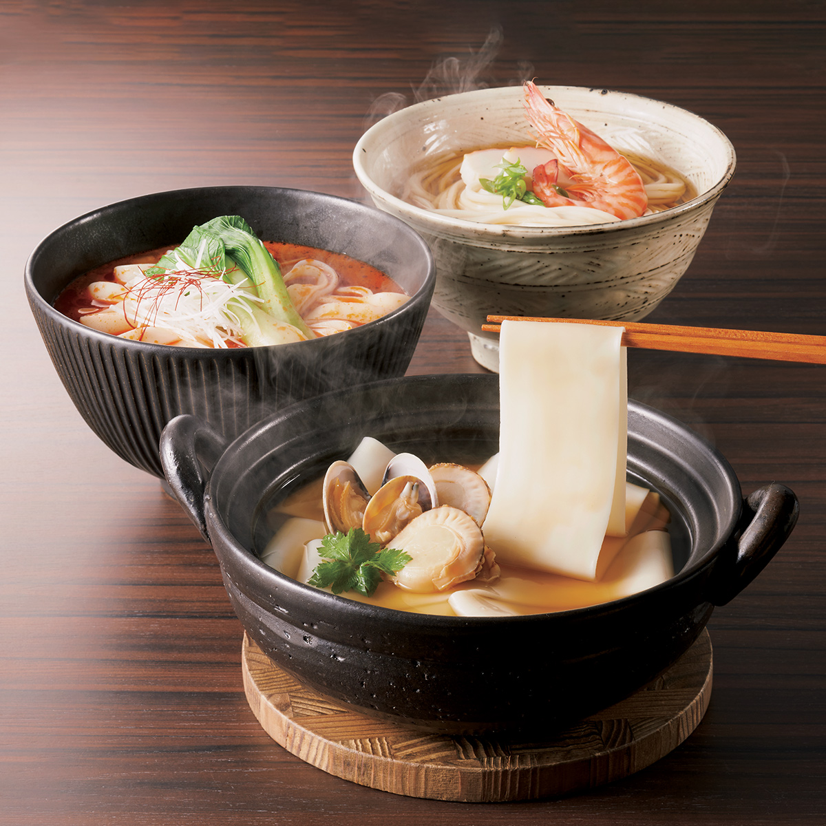 群馬名物の幅広麺など、国産小麦一等粉を使った3種の麺と、3種のつゆのセットです。