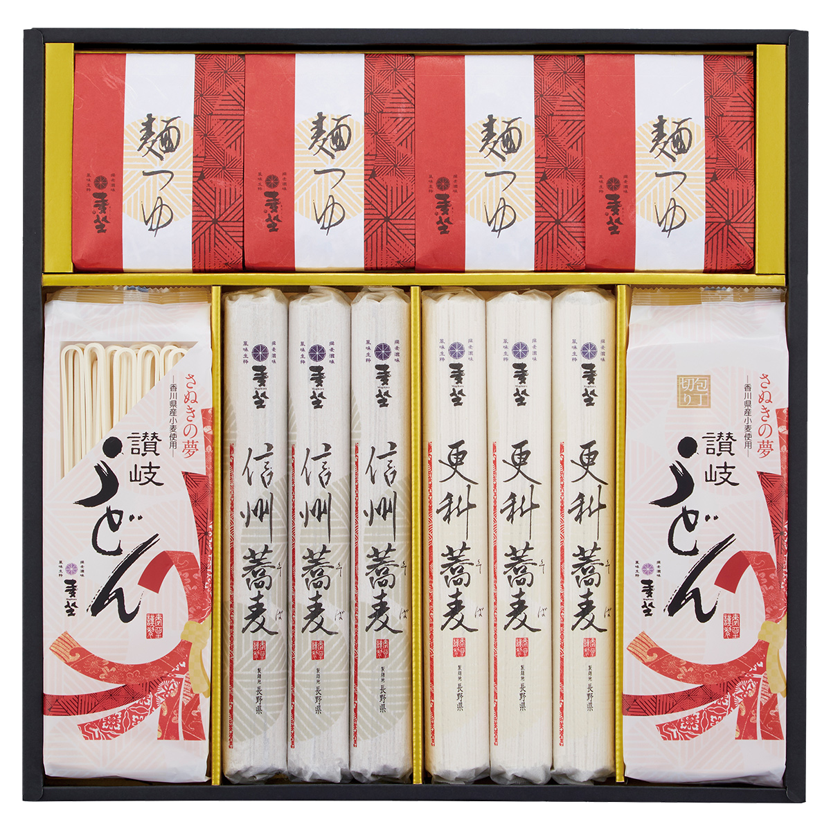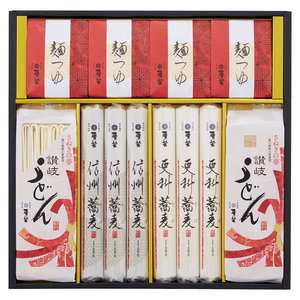 ●内容:信州そば・更科そば各160g×3、香川県産小麦使用讃岐うどん170g×2、鰹めんつゆ30g×8