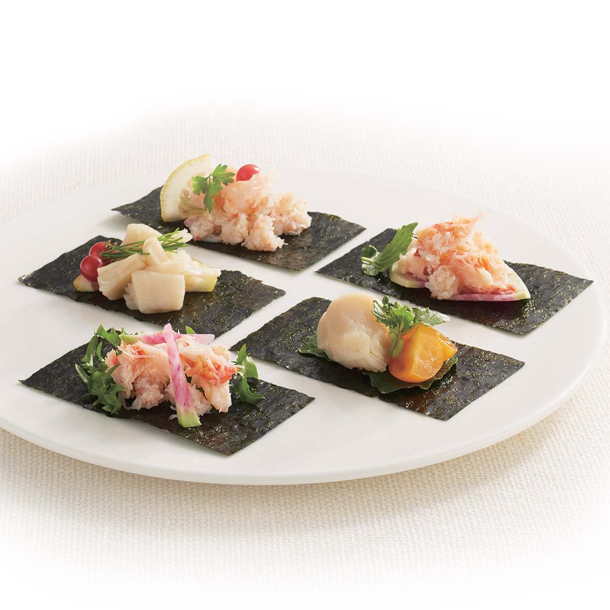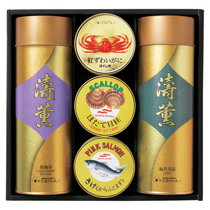 ●内容:紅ずわいがにほぐし肉60g、ほたて貝柱95g、さけ水煮90g、焼海苔(8切4枚12袋)、のり茶漬け(10袋)
