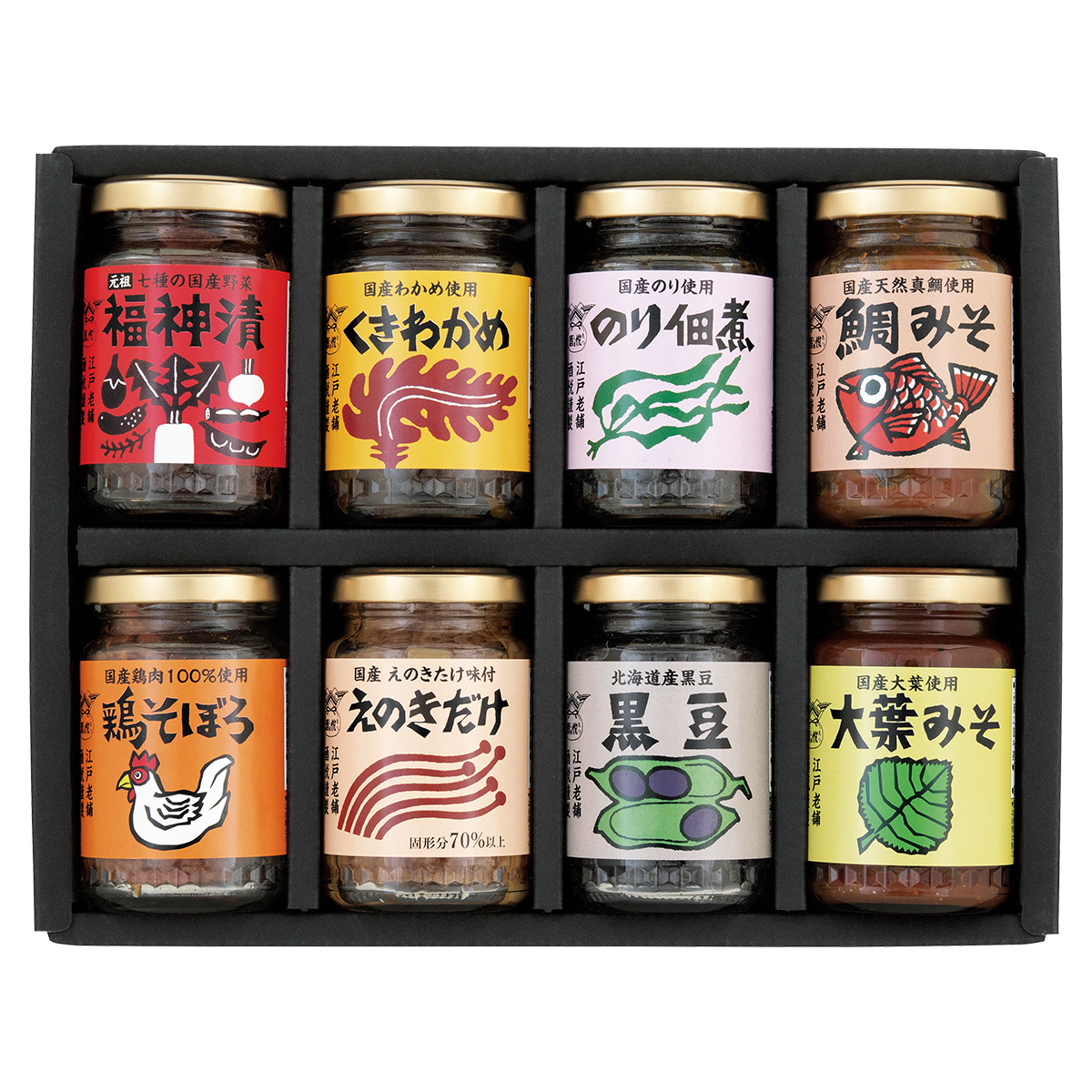 ●内容:元祖福神漬90g、くきわかめ75g、のり佃煮95g、鯛みそ100g、鶏そぼろ50g、えのきだけ90g、黒豆100g、大葉みそ100g