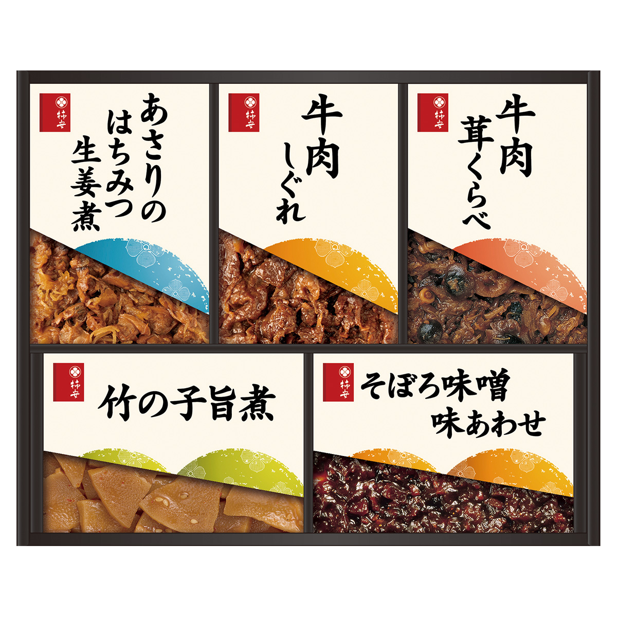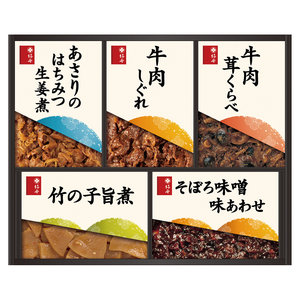 ●内容:牛肉しぐれ・牛肉茸くらべ・竹の子旨煮 各50g、あさりのはちみつ生姜煮40g、そぼろ味噌味あわせ90g