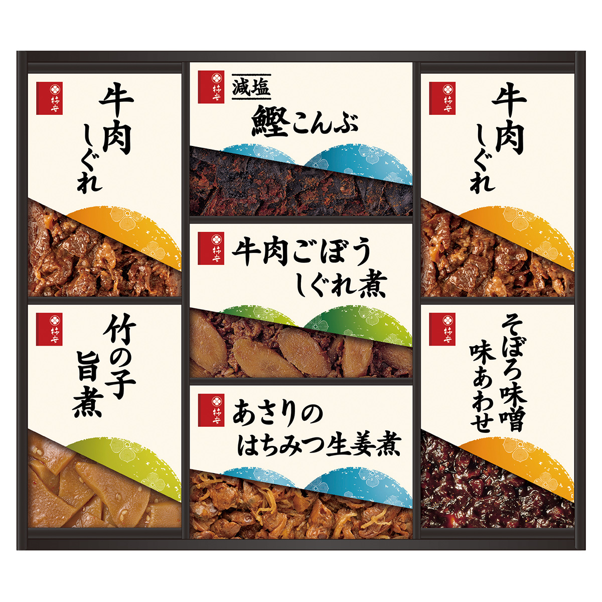 ●内容:牛肉しぐれ50g×2、牛肉ごぼうしぐれ煮・減塩 鰹こんぶ・竹の子旨煮 各50g、あさりのはちみつ生姜煮40g、そぼろ味噌味あわせ90g