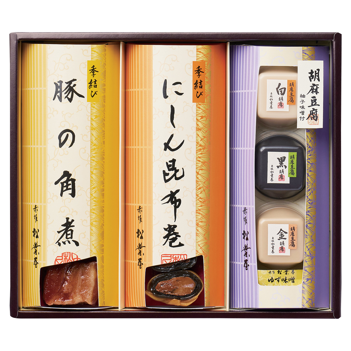 ●内容:にしん昆布巻80g、豚の角煮100g、胡麻豆腐(白・黒・金 各43g、柚子味噌たれ7g×3)