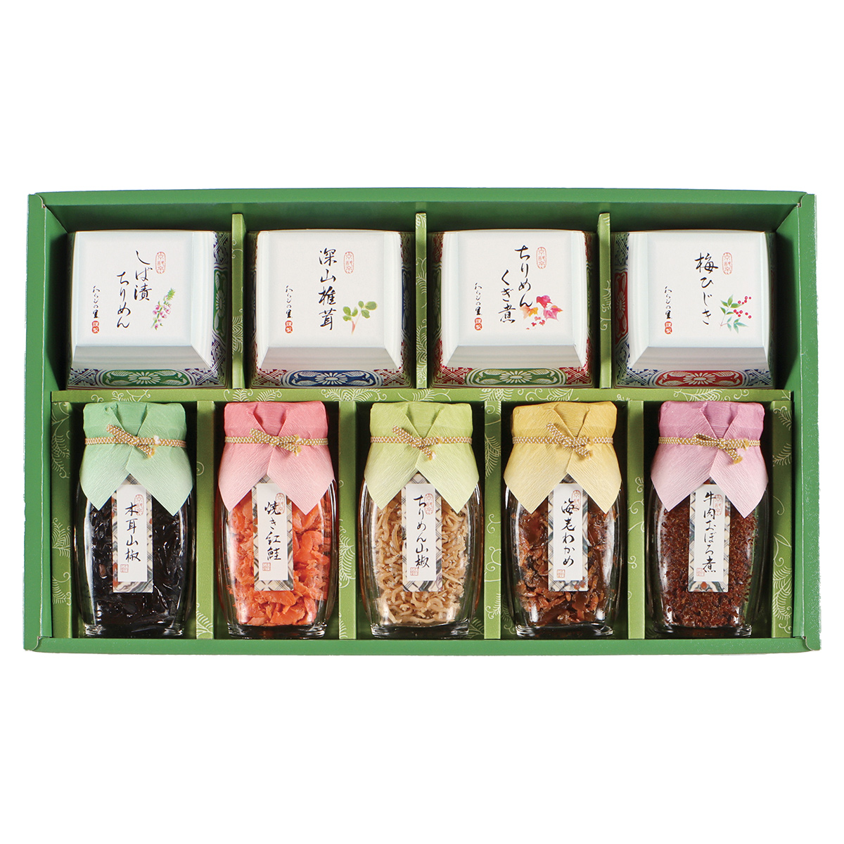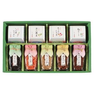●内容:ちりめん山椒30g、焼き紅鮭43g、海老わかめ65g、牛肉おぼろ煮・深山椎茸 各60g、木耳山椒55g、ちりめんくぎ煮・梅ひじき・しば漬ちりめん各50g
