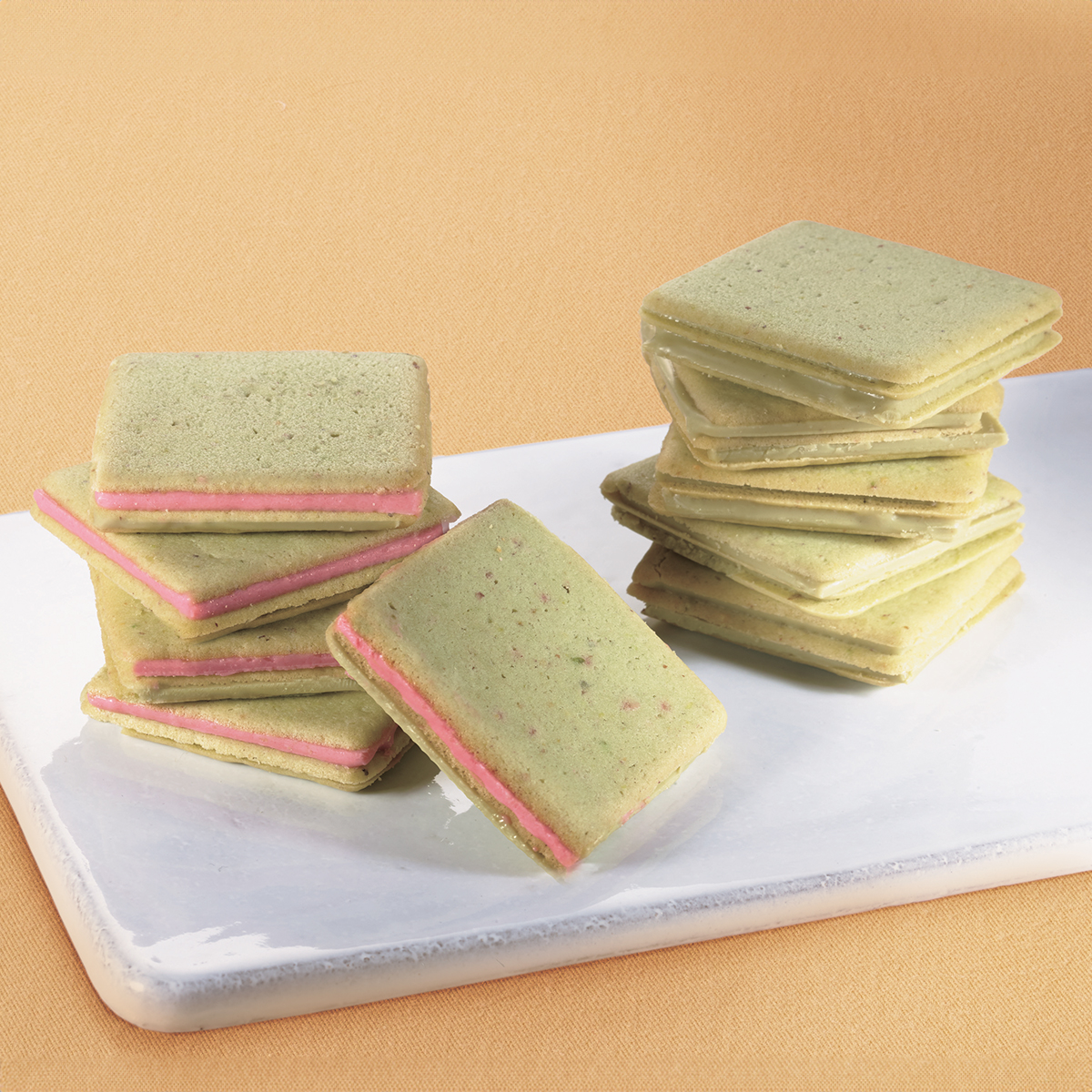 ピスタチオ風味のチョコレートとクッキーのサンド「ピスタチオ&ピスタチオ」と、フランボワーズチョコレートをプラスした「ピスタチオ&フランボワーズ」をセットにしました。