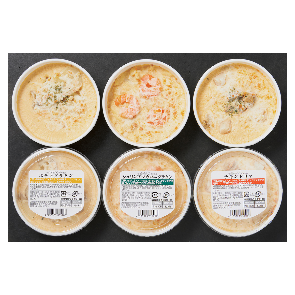 ●内容:シュリンプマカロニグラタン120g×2、ポテトグラタン135g×2、チキンドリア135g×2