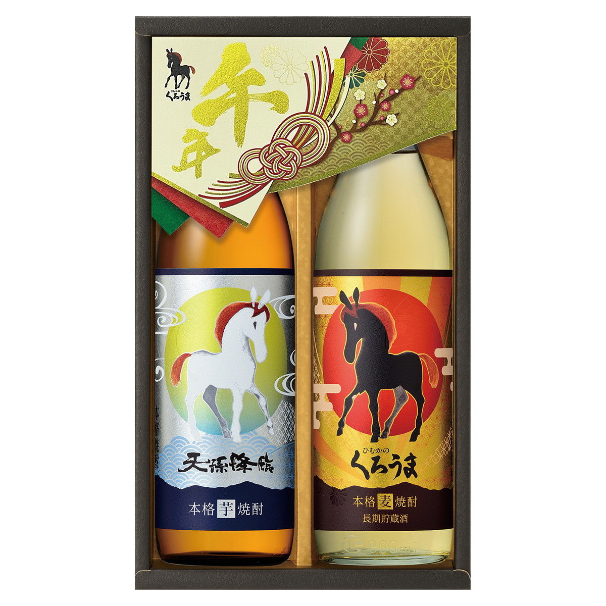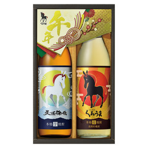 ●内容:慶祝 天孫降臨ボトル(芋・白麹)、慶祝くろうまボトル(麦・樽熟成) 各900ml