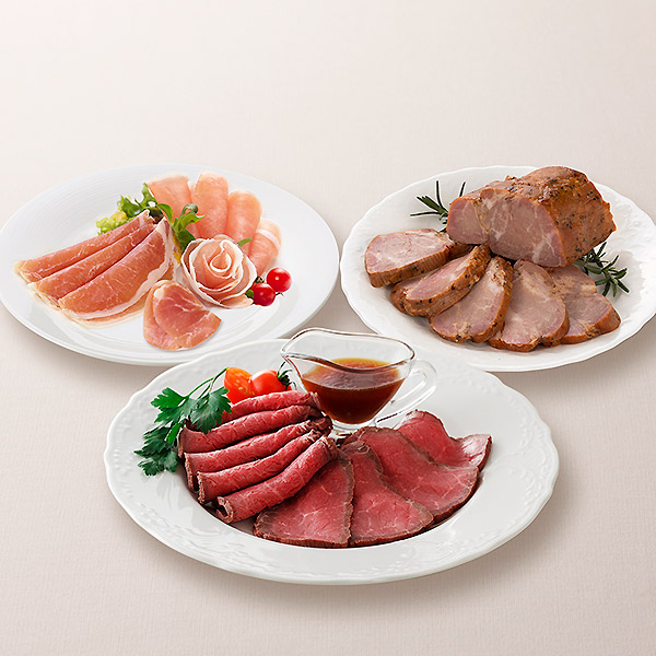 ◎ネット限定品ローストビーフ・ローストポークは、素材を真空パックしてから加熱調理する「真空調理製法」で風味や旨味をのがさず、やわらかくジューシーに仕上げております。生ハムも入ったおすすめのセットです。