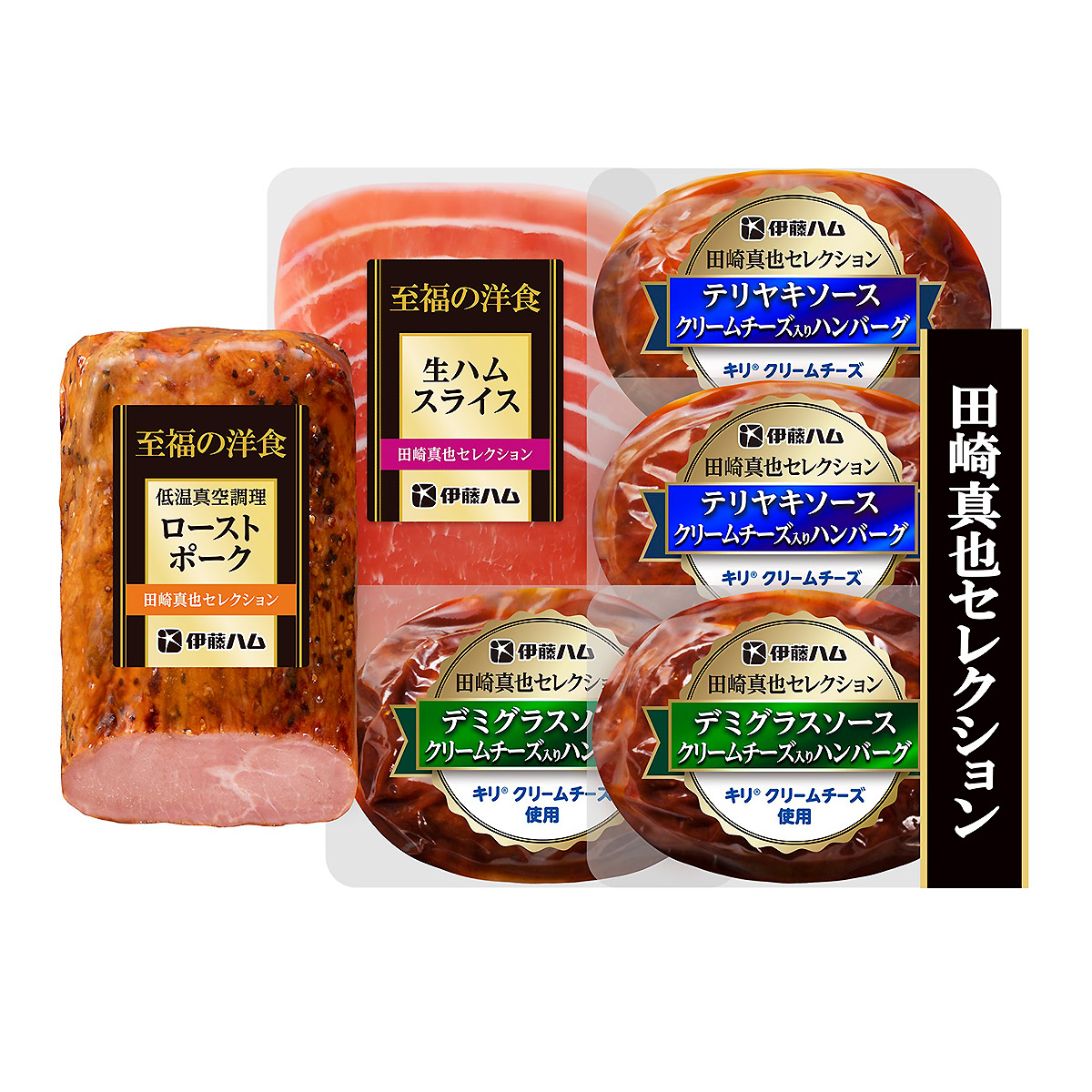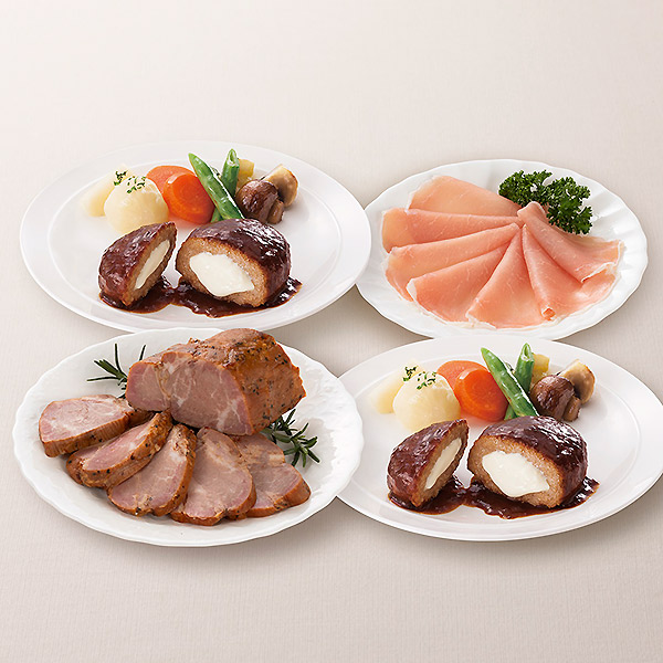 ●内容:生ハムロース45g、クリームチーズ入りハンバーグ(テリヤキソース)77g×2、クリームチーズ入りハンバーグ(デミグラスソース)77g×2、ローストポーク160g