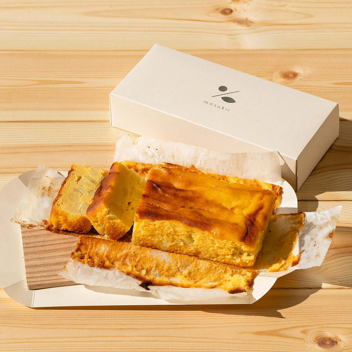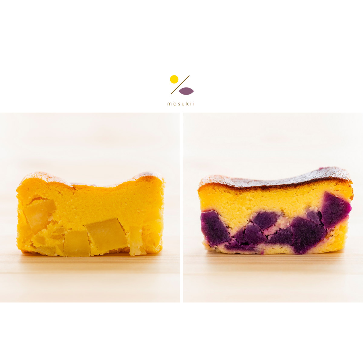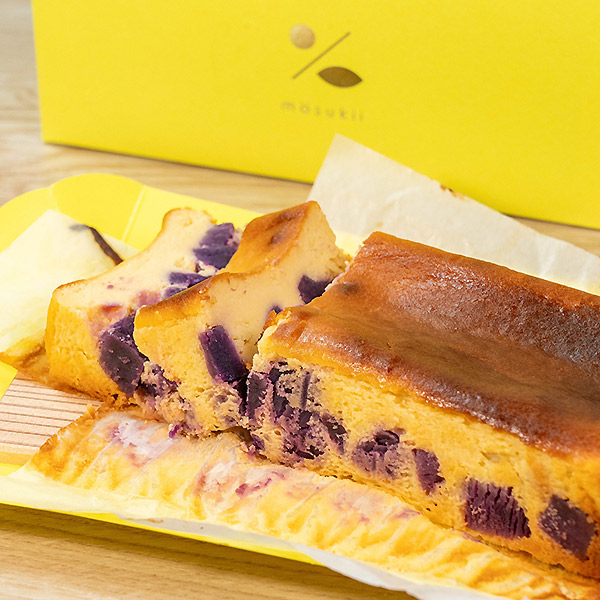 『いも、すき。』をコンセプトに九州産のさつま芋を贅沢に50%以上使った小麦粉不使用のさつまいもケーキ(プレーン)と(チーズ)の食べ比べセット。芋本来の味を楽しんでもらいたいという想いから余計なものを省き、芋本来の味を味わえるmosukiiさつまいもケーキ(プレーン)、お芋独自の味わいを大切にしながらチーズをたっぷりと練りこんだmosukiiさつまいもケーキ(チーズ)2種類の違いをぜひ楽しんでくださいね。パッケージの下の箱を広げ、袋から出せばそのまま簡単に切り分けができるように九州の木材を使った小さなカッティングボードを入れています。大切な人とのおうちカフェや、ギフトや手土産にもぴったりなお芋たっぷりの特別なお取り寄せスイーツ。芋好きのあなたにぜひ食べてほしい贅沢なケーキをぜひご賞味ください。